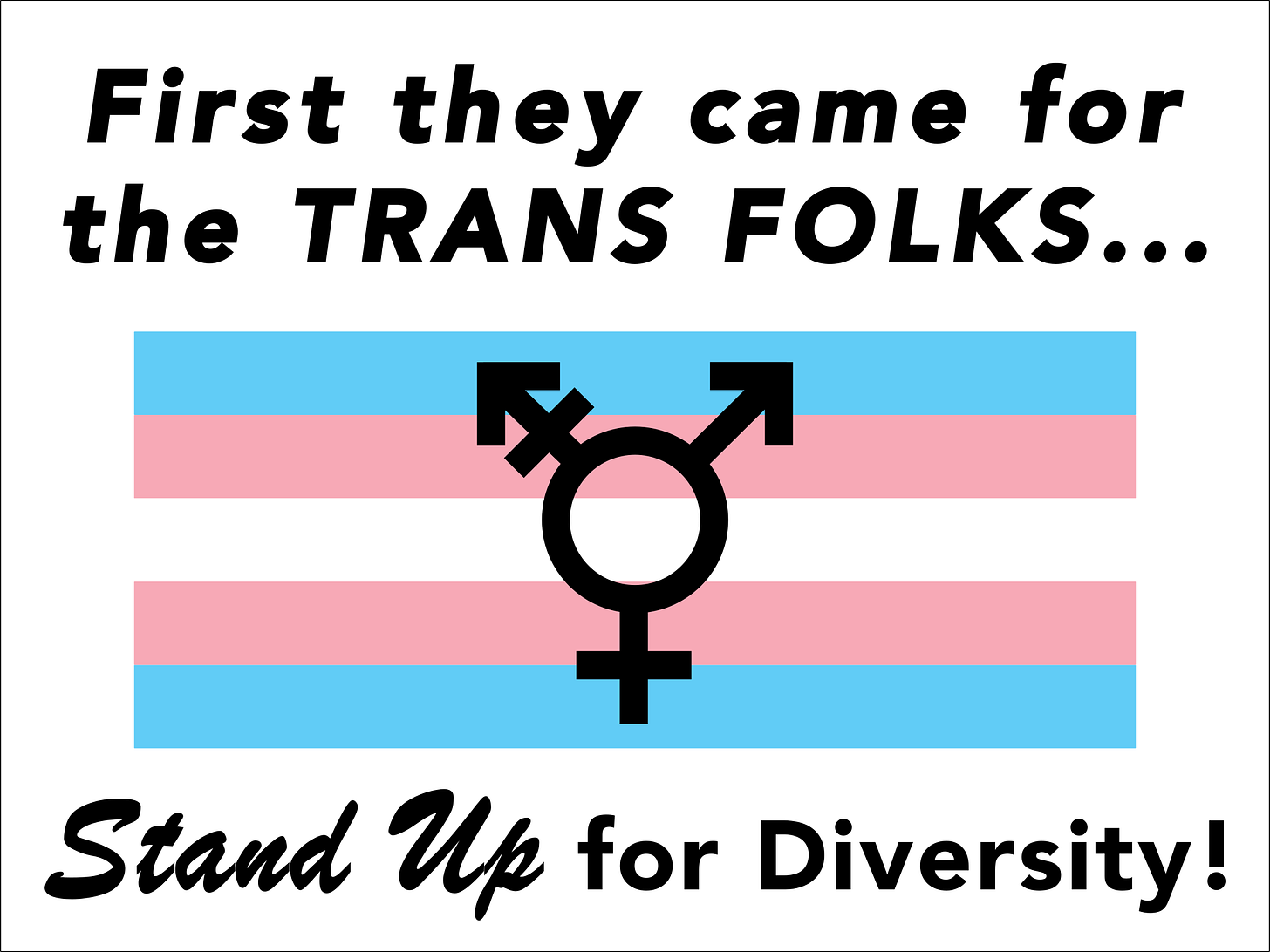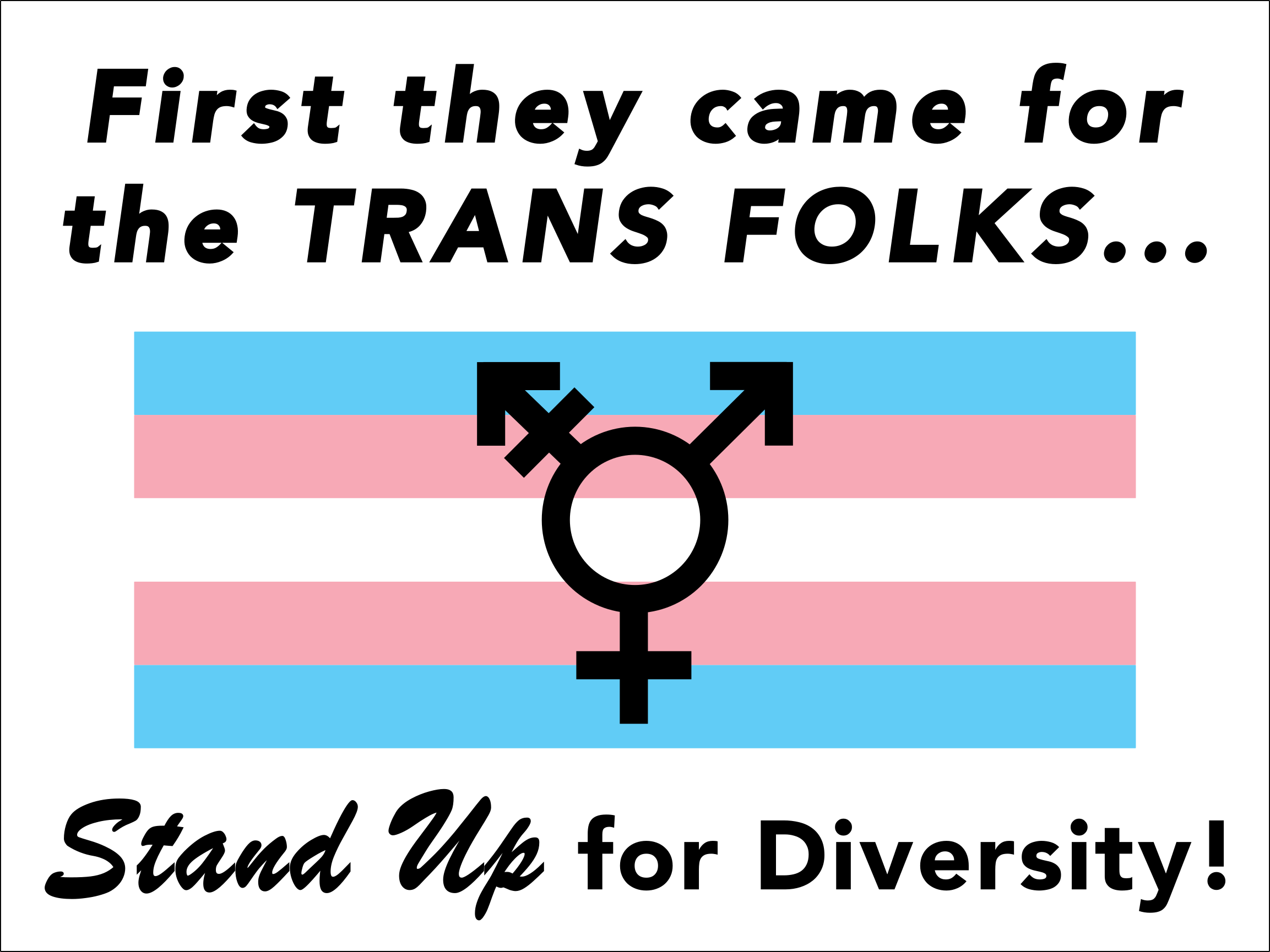 SIGN: “First They Came for the TRANS Folks - Stand UP for Diversity.” 24”x18” landscape orientation. CLICK HERE to download the full size files.
