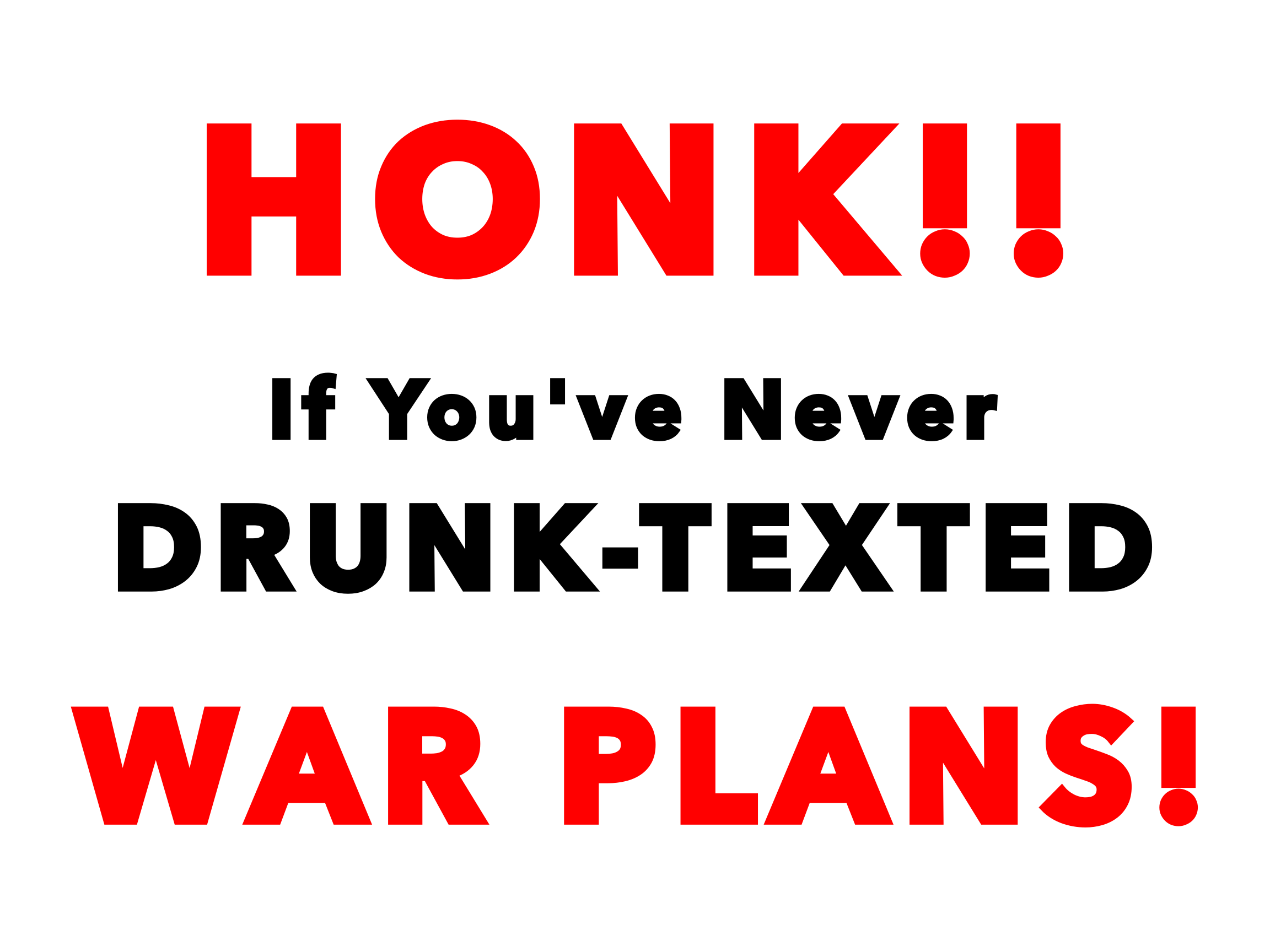 SIGN: “HONK!! If You’ve never Drunk-Texted WAR PLANS.” 24”x18” landscape orientation. CLICK HERE to download the full size files: