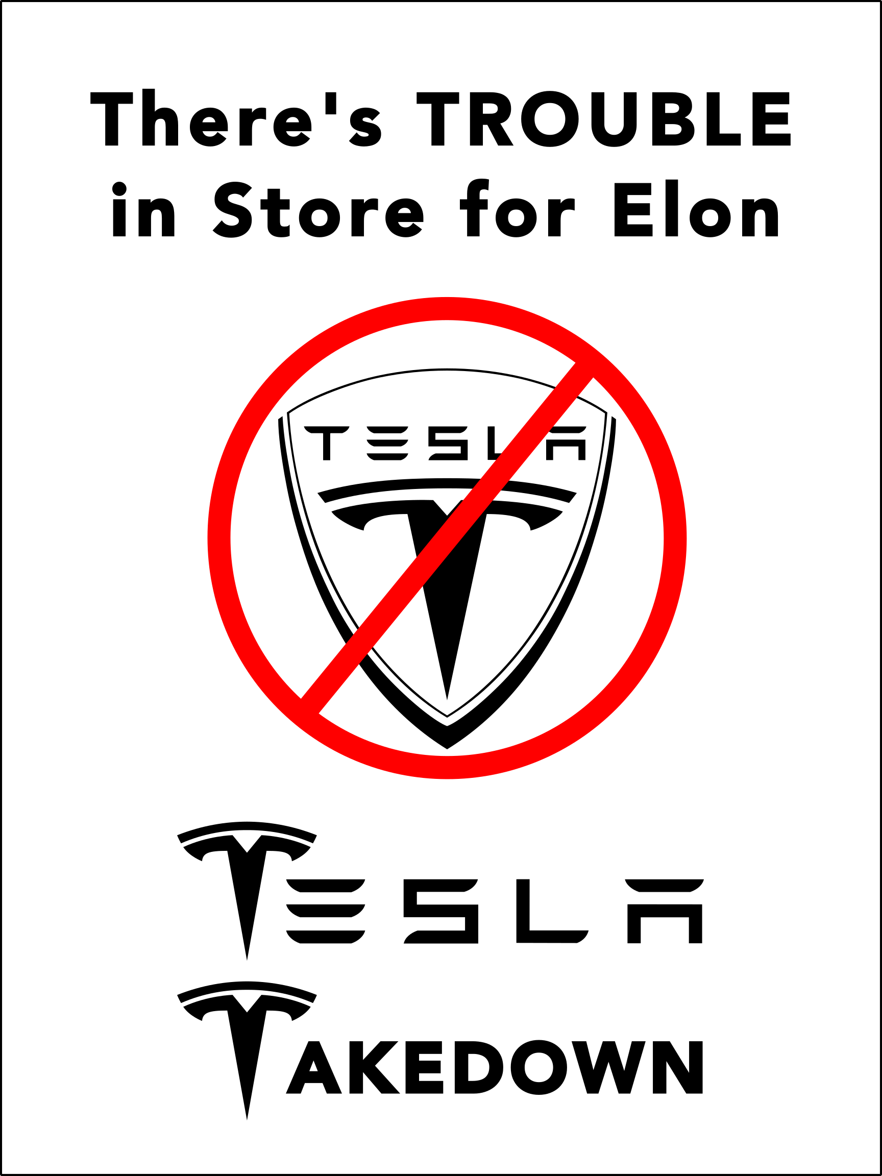 SIGN: “There's TROUBLE in Store for Elon - Tesla Takedown.” 18”x24” portrait orientation. CLICK HERE to download the full size files: