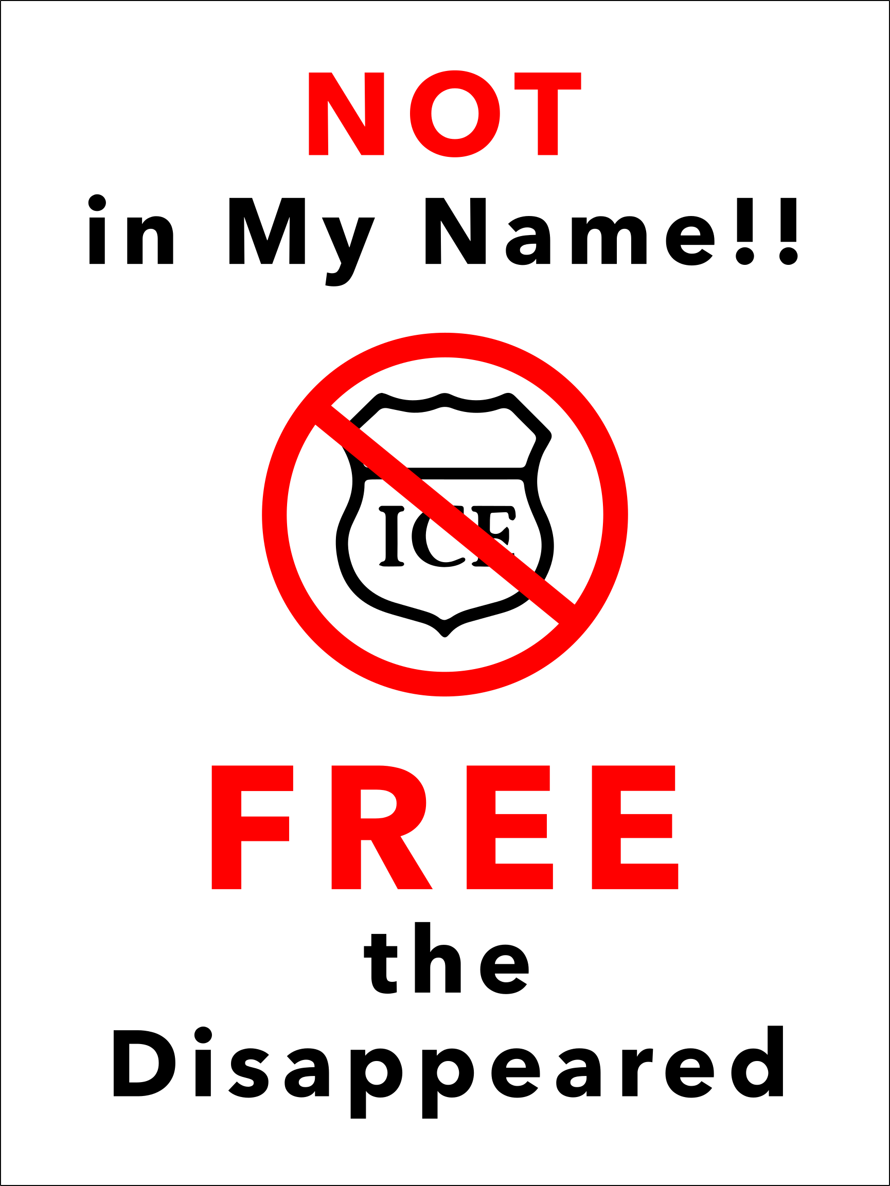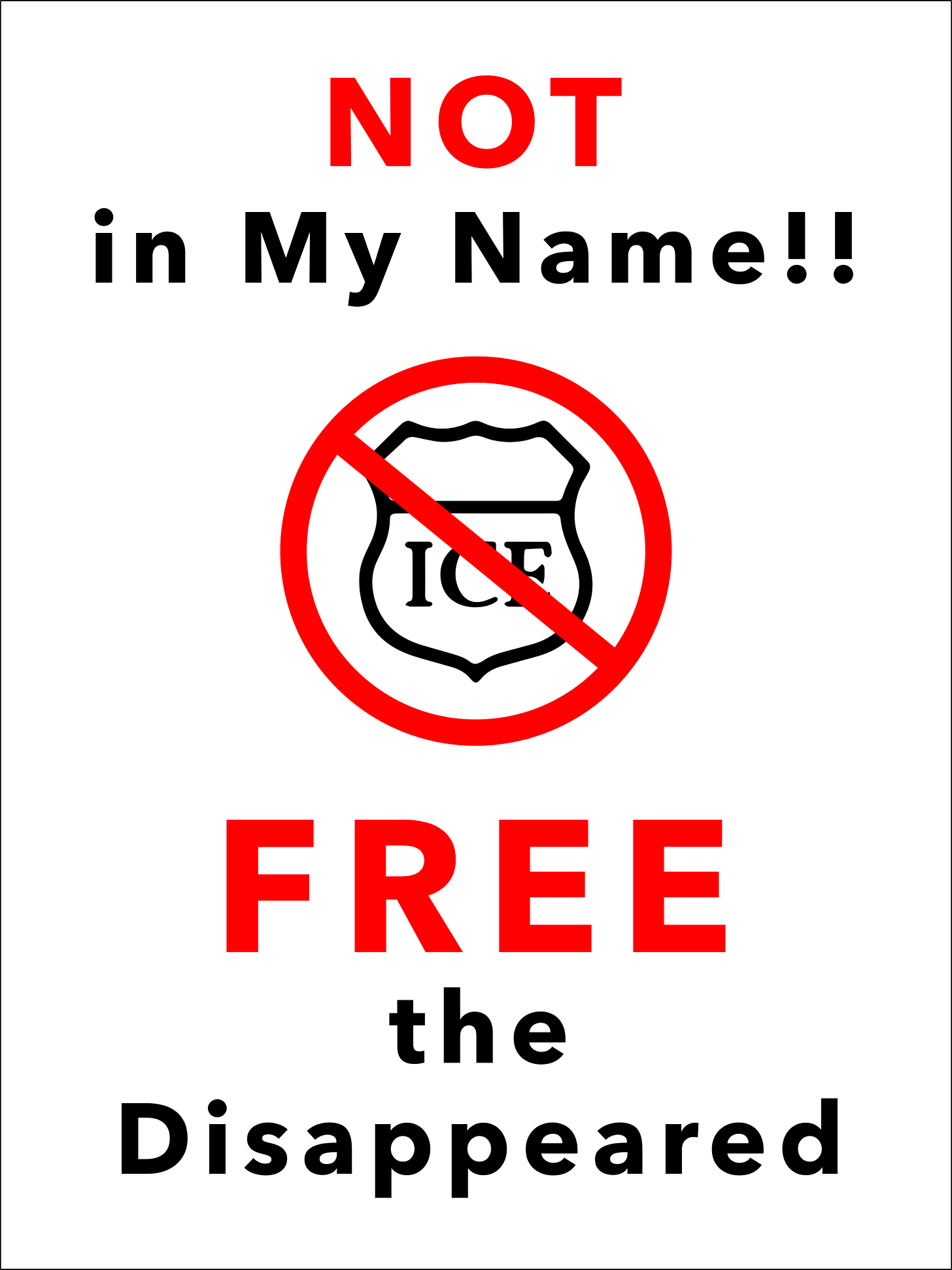 SIGN: “Not in My Name!! - No ICE - Free the Disappeared.” 18”x24” portrait orientation. CLICK HERE to download the full size files.