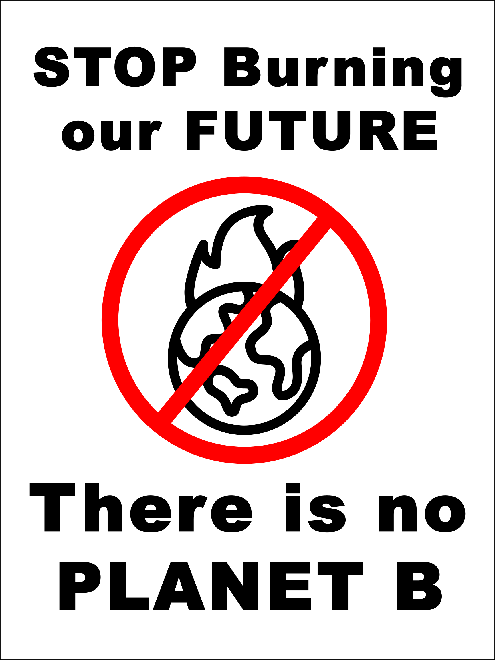 SIGN: “STOP Burning Our Future - There is No PLANET B.” 18”x24” portrait orientation. CLICK HERE to download the full size files.