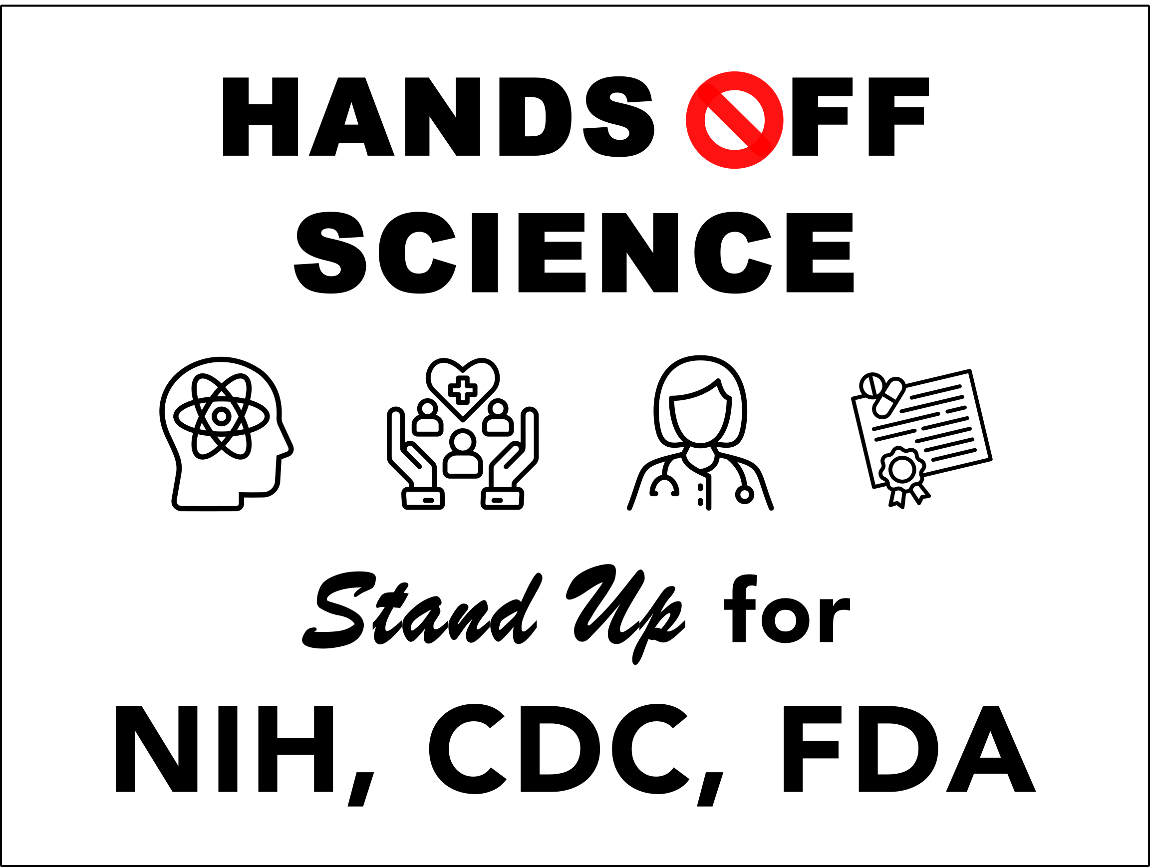 SIGN: “HANDS OFF SCIENCE - Stand UP for NIH, CDC, FDA.” 24”x18” landscape orientation. CLICK HERE to download the full size files: