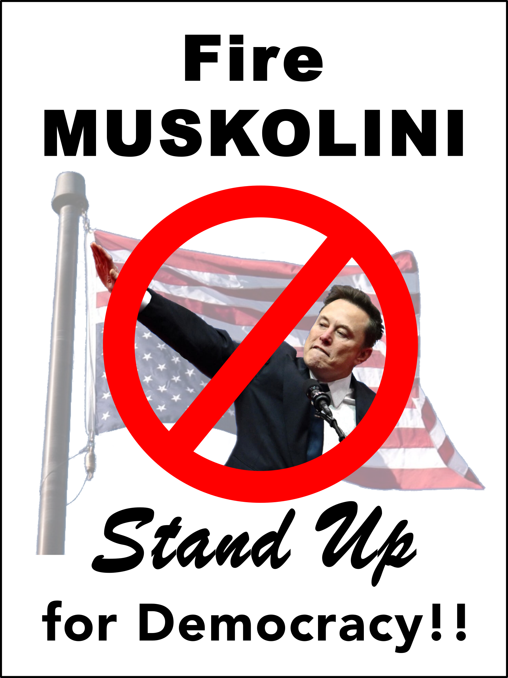 SIGN: “FIRE MUSKOLINI - Stand Up for Democracy.” 18”x24” portrait orientation. CLICK HERE to download the full size files.