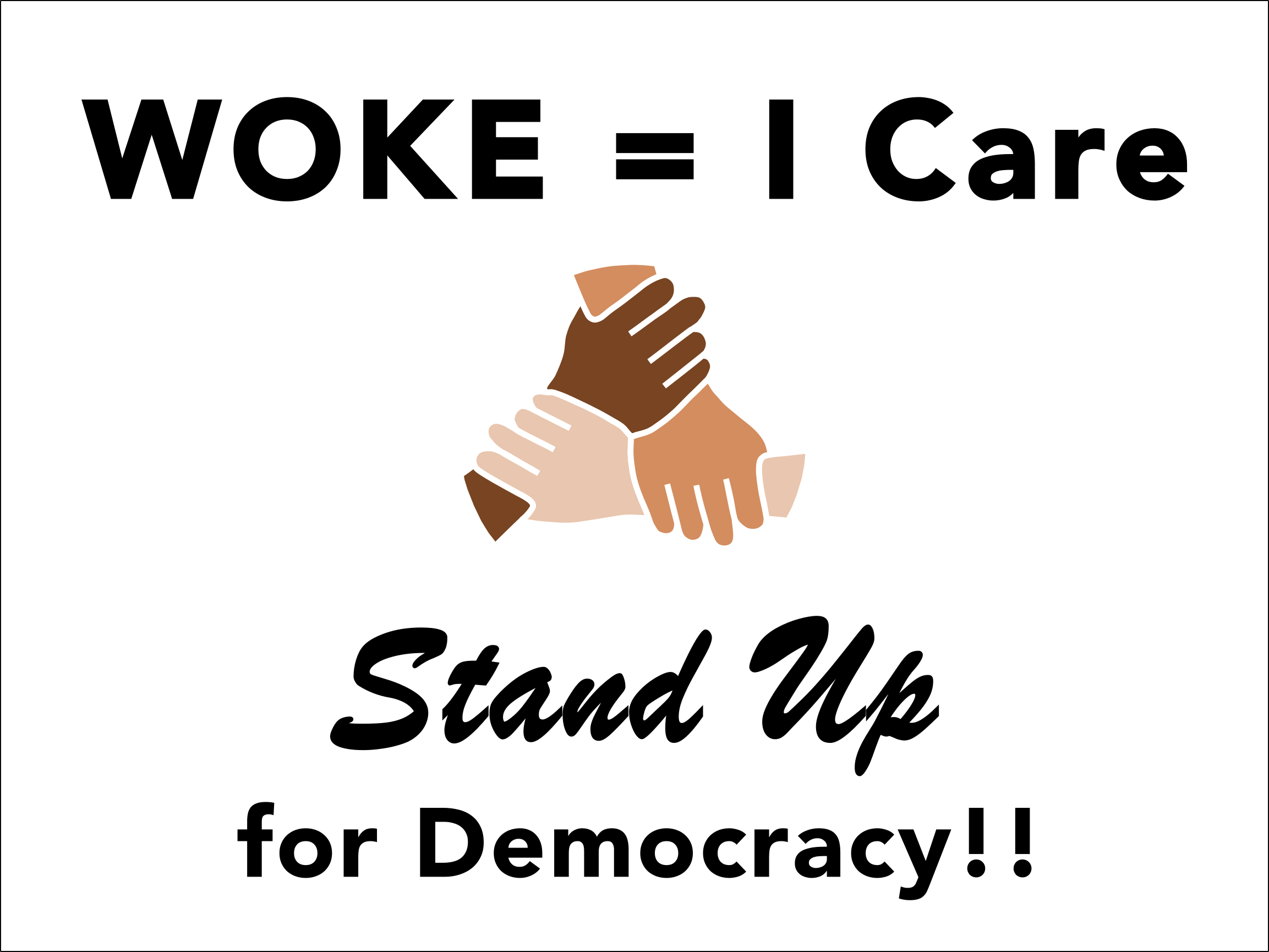 SIGN: “WOKE = I Care - Stand UP for Democracy.” 24”x18” landscape orientation. CLICK HERE to download the full size files: