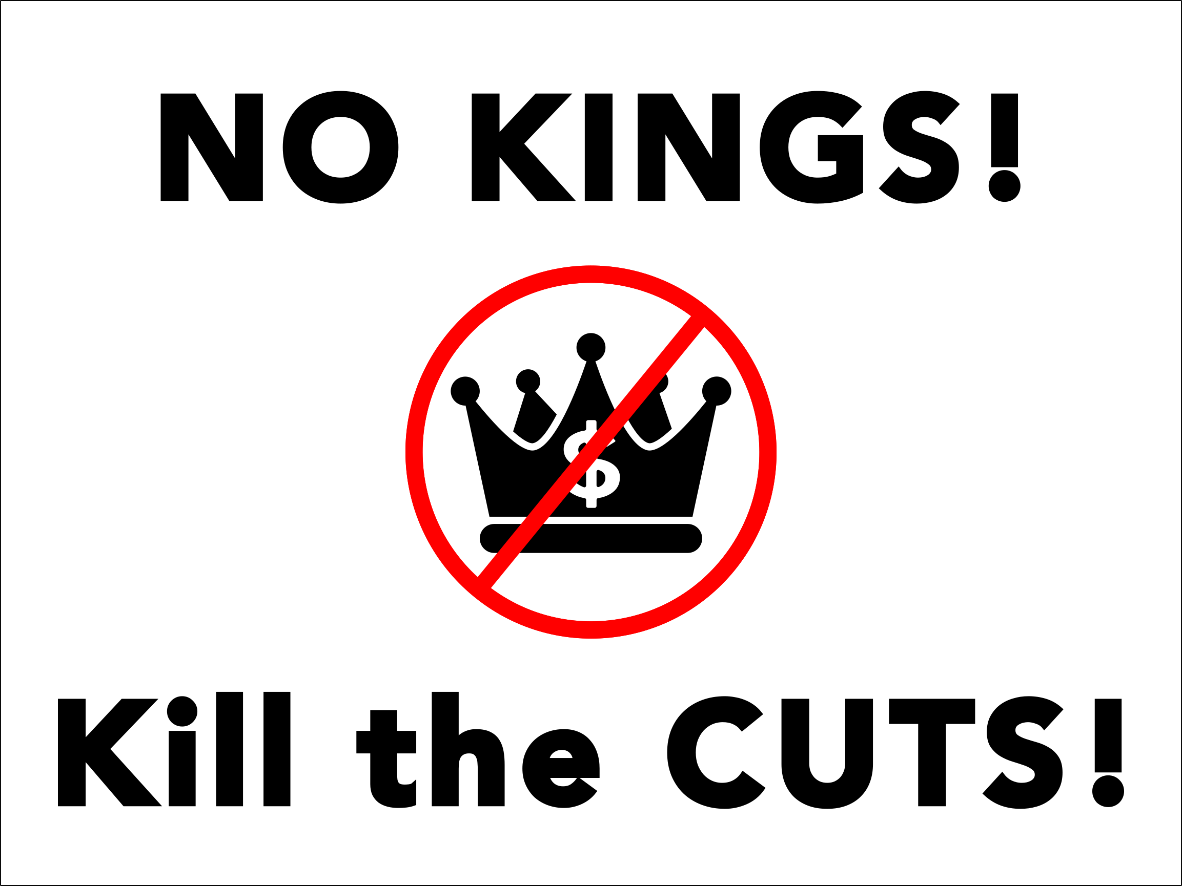 SIGN: “NO KINGS! - KILL THE CUTS!” 24”x18” landscape orientation. CLICK HERE to download the full size files: