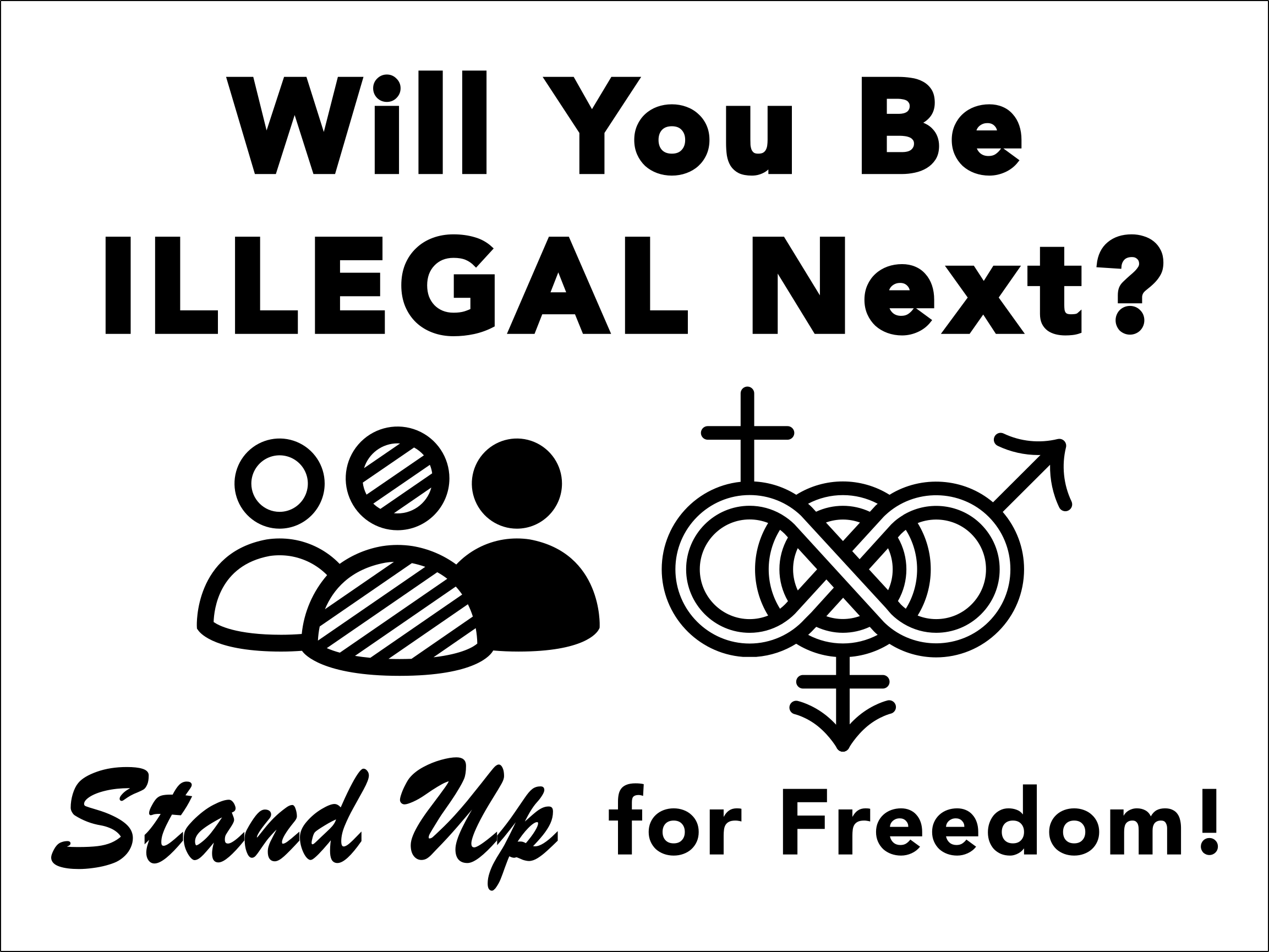 SIGN: “Will You be ILLEGAL Next? Stand UP for Freedom,” with People of Color and Queer-Trans icons. 24”x18” landscape orientation. CLICK HERE to download the full size files.