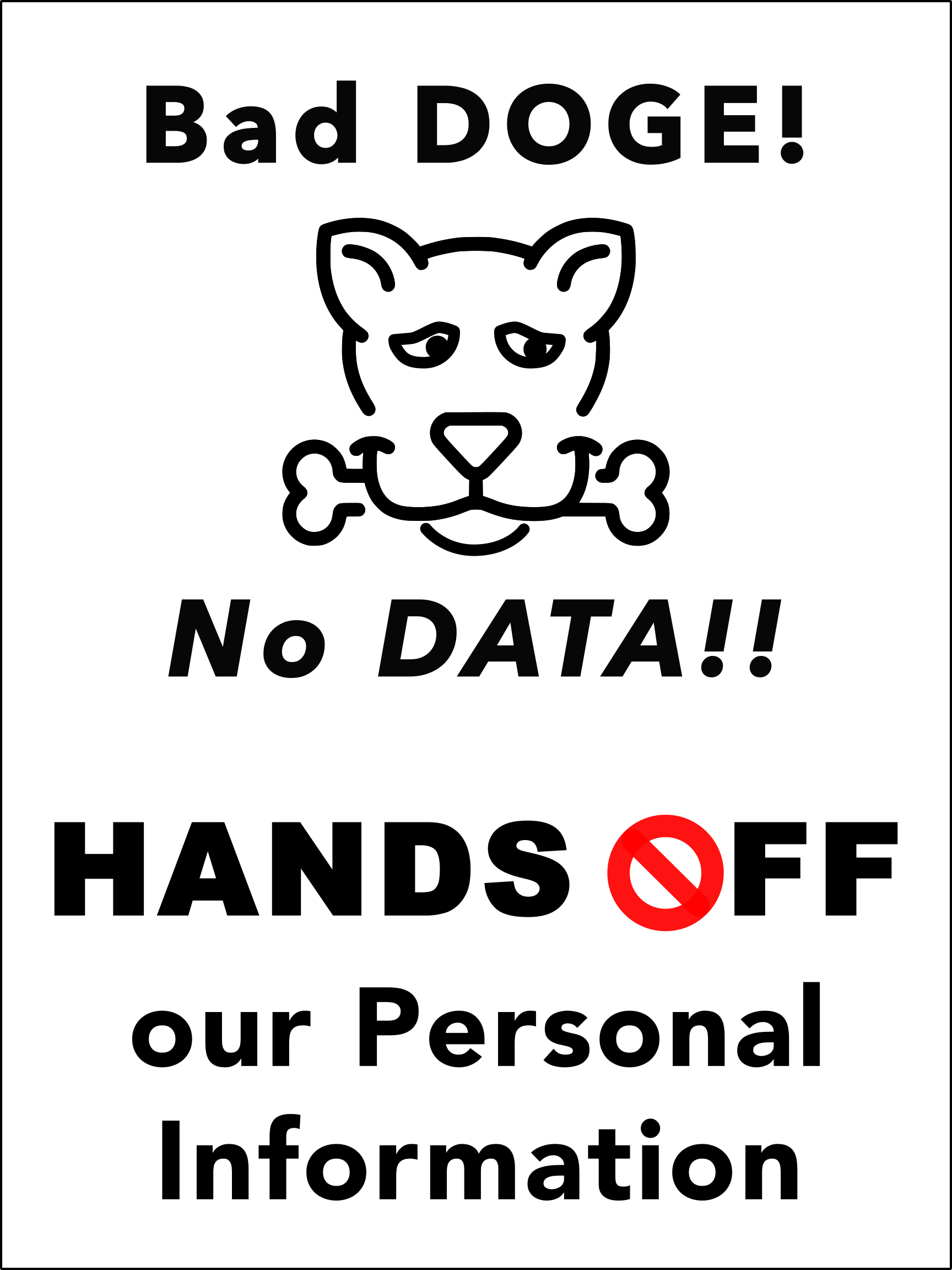 SIGN: “Bad DOGE! No DATA!! HANDS OFF our Personal Information.” 18”x24” portrait orientation. CLICK HERE to download the full size files.