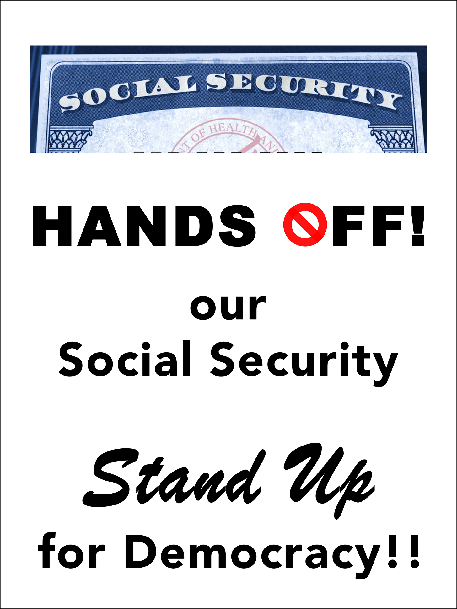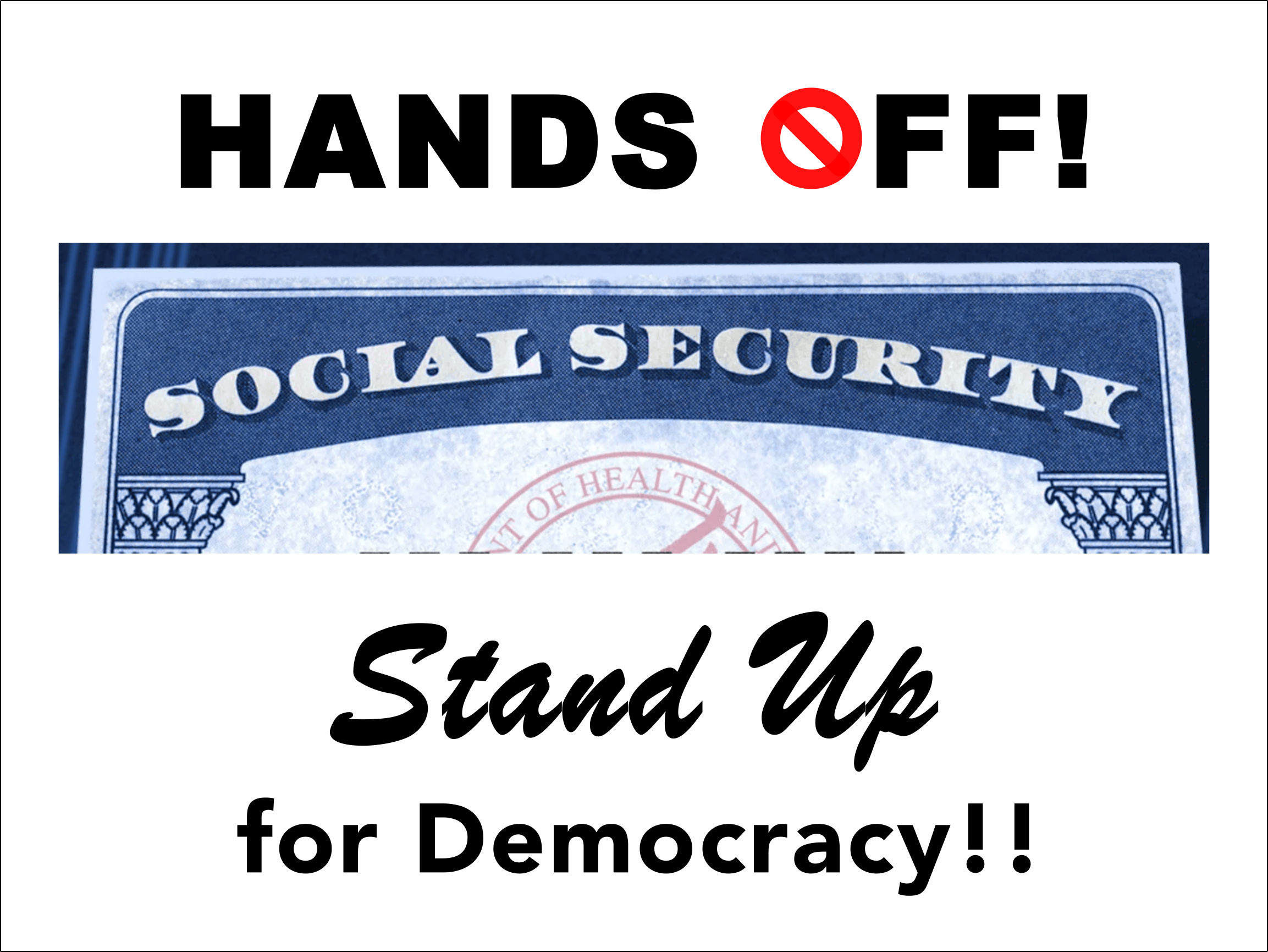SIGN: “HANDS OFF our SOCIAL SECURITY - Stand UP for Democracy.” 18”x24” portrait orientation. CLICK HERE to download the full size files.
