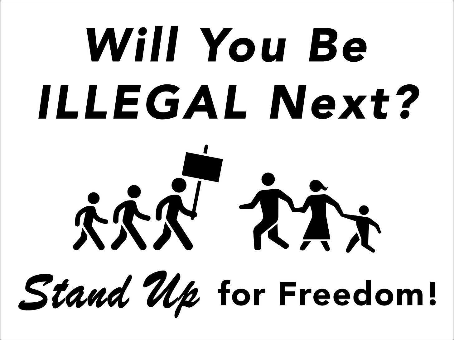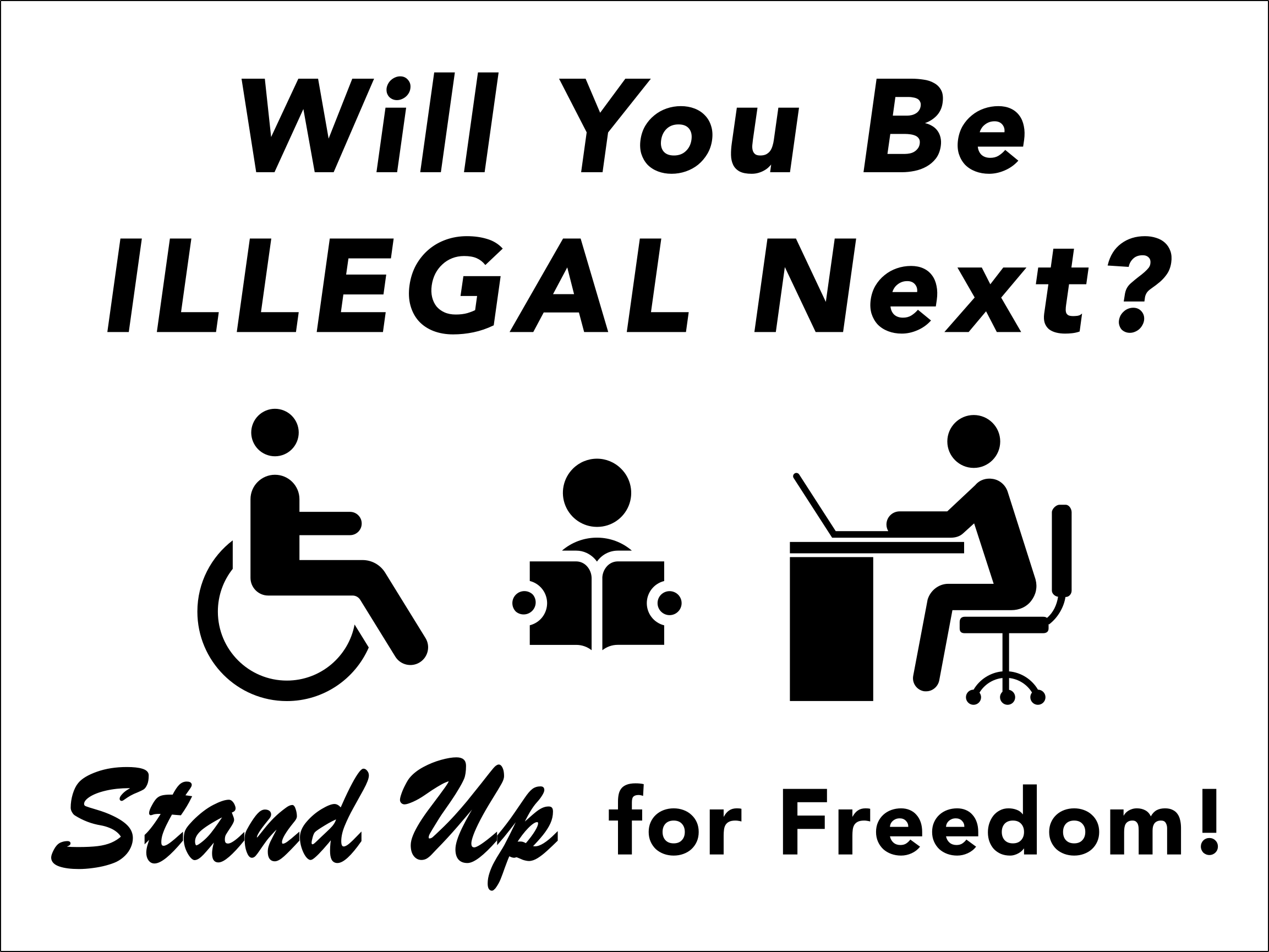 SIGN: “Will You be ILLEGAL Next? Stand UP for Freedom,” with Disabled, Student, and Office Worker icons. 24”x18” landscape orientation. CLICK HERE to download the full size files.