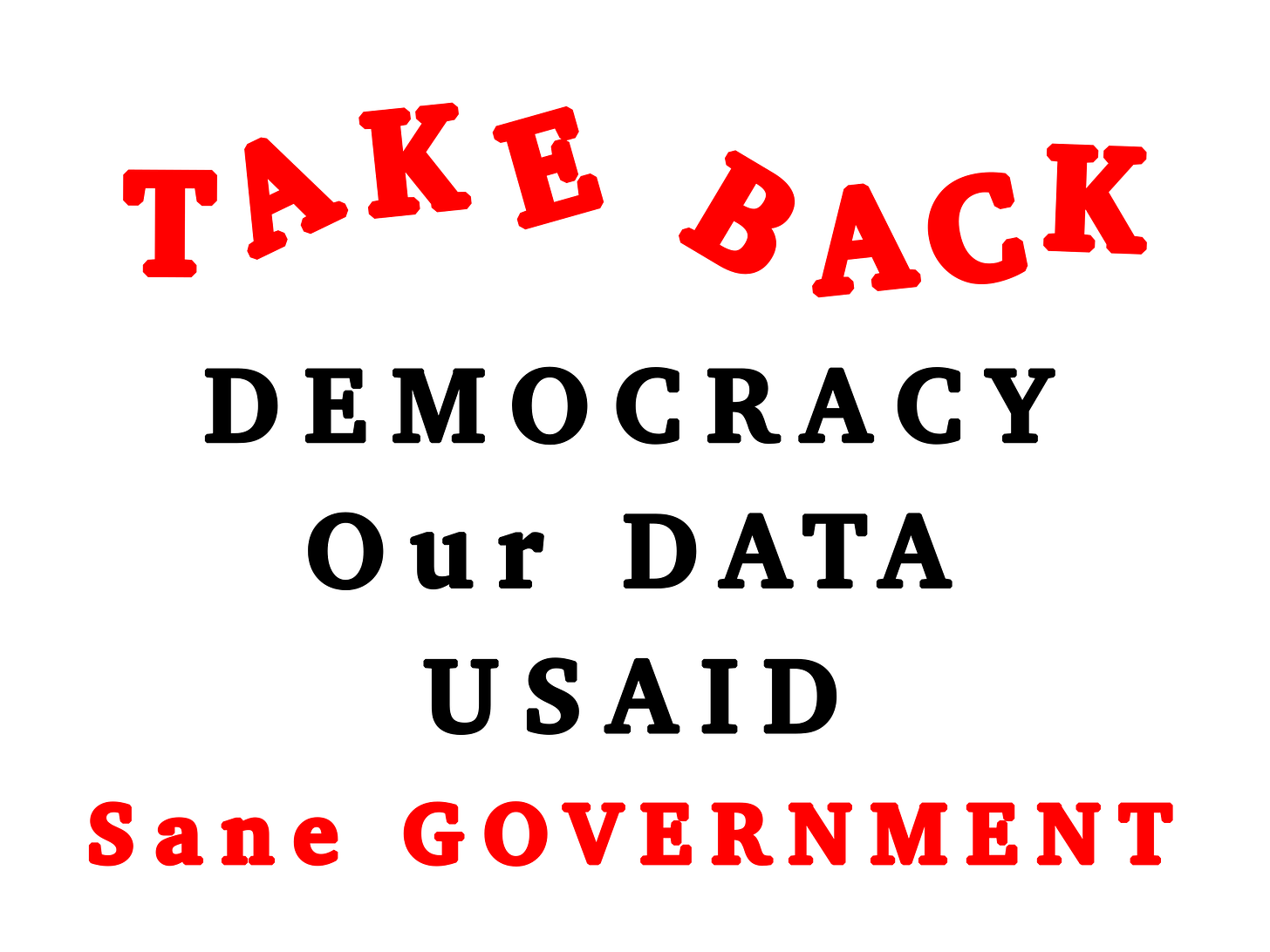 SIGN: “TAKE BACK DEMOCRACY - Our DATA - USAID - Sane GOVERNMENT!” 24”x18” landscape orientation. CLICK HERE to download the full size files: