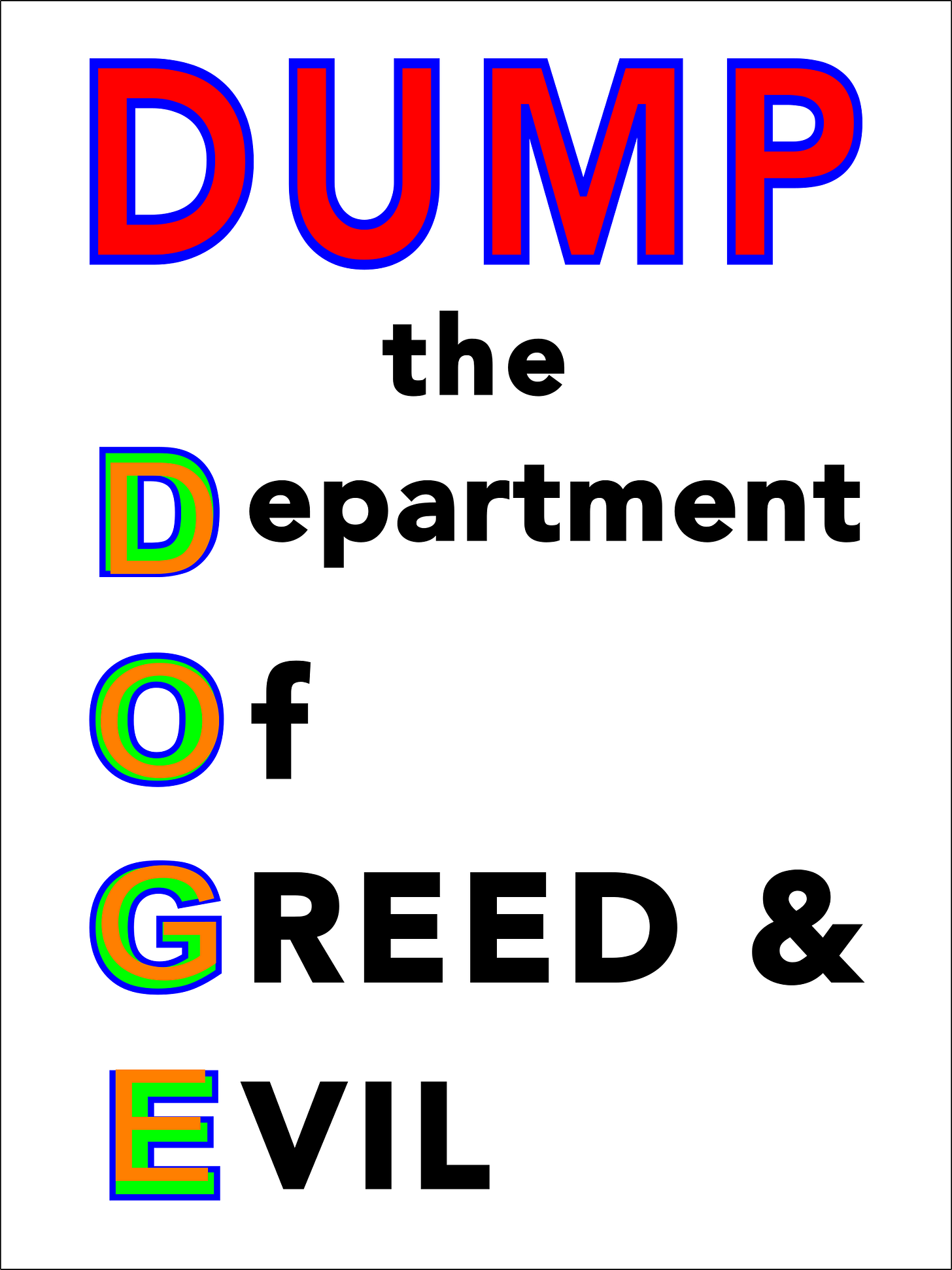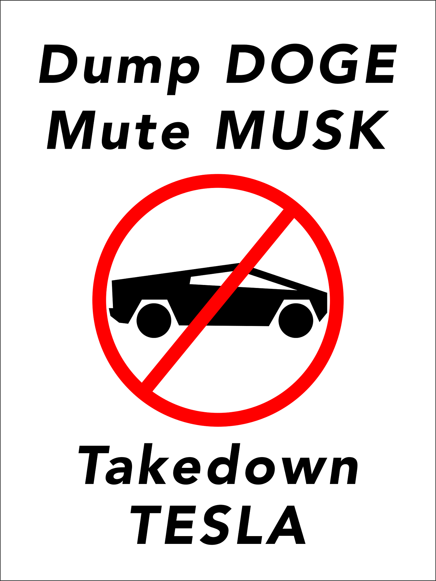SIGN: “Dump DOGE - Mute MUSK - Takedown TESLA.” 18”x24” portrait orientation. CLICK HERE to download the full size files.