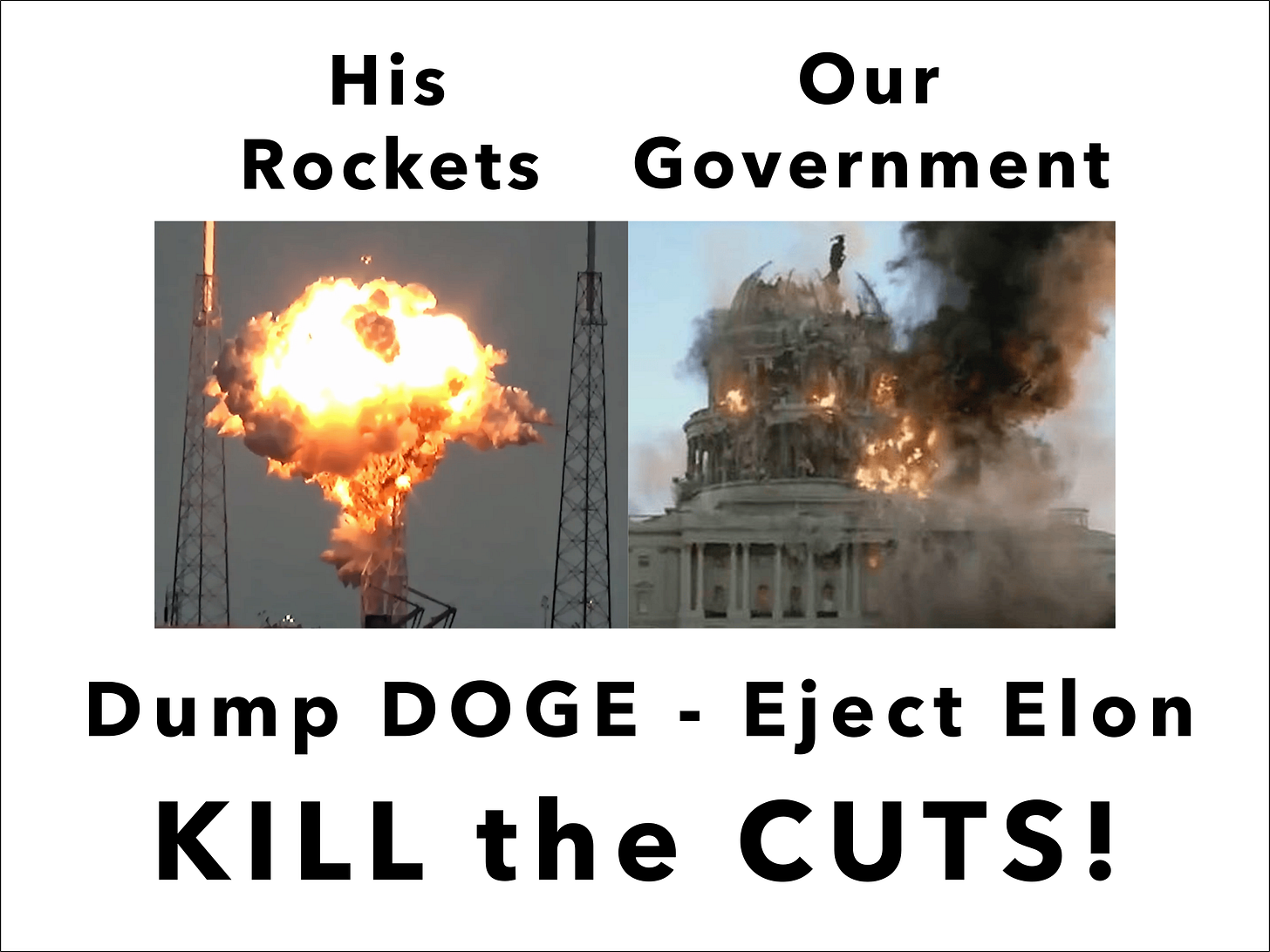SIGN: “His Rockets - Our Government - Dump DOGE - Eject Elon - KILL the Cuts!” 24”x18” landscape orientation. CLICK HERE to download the full size files.