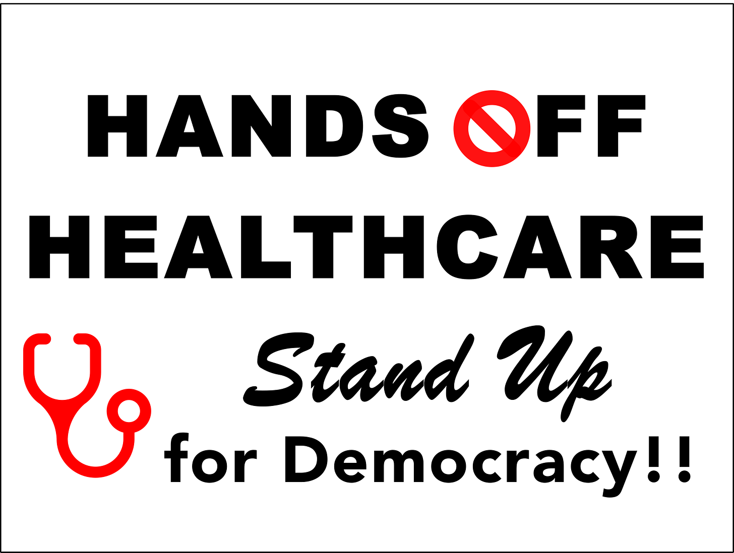 SIGN: “HANDS OFF HEALTHCARE. Stand Up for Democracy.” 24”x18” landscape orientation. CLICK HERE to download the full size files.