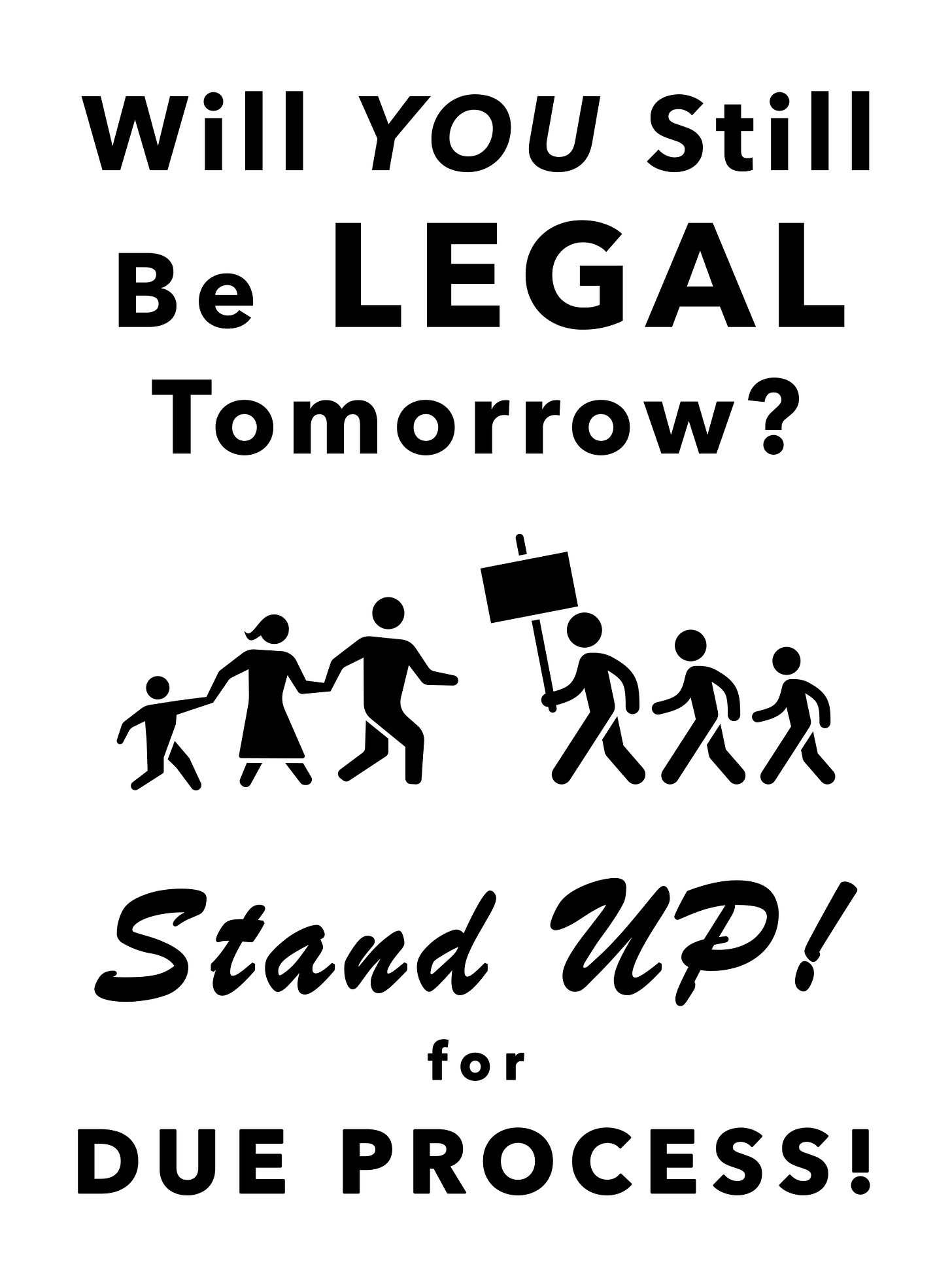 SIGN: “Will You Still be Legal Tomorrow? Stand UP. for DUE PROCESS!” 18”x24” portrait orientation. CLICK HERE to download the full size files.