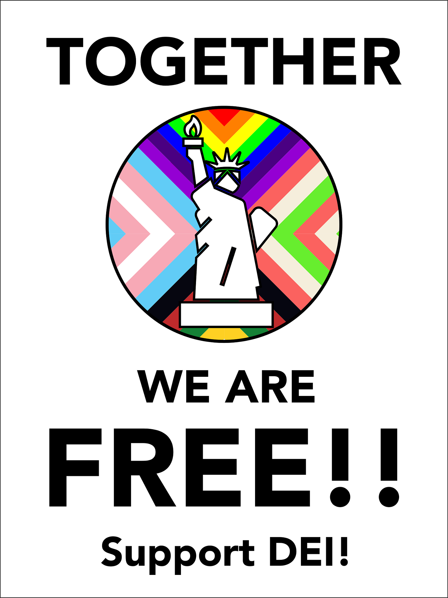 SIGN: “TOGETHER WE ARE FREE! Support DEI - with Statue of Liberty icon.” 18”x24” portrait orientation. CLICK HERE to download the full size files.