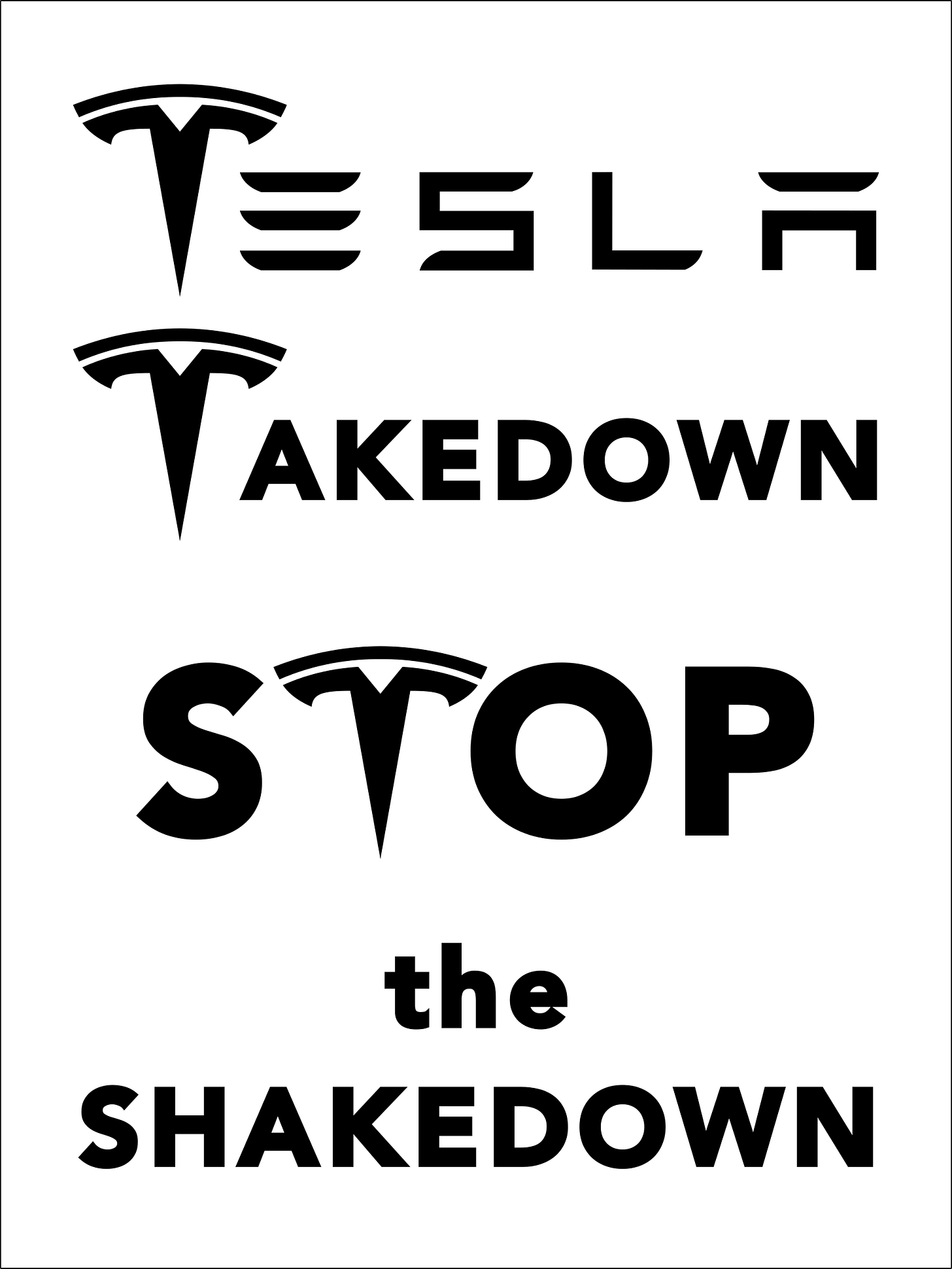 SIGN: “TESLA Takedown - STOP the Shakedown.” 18”x24” portrait orientation. CLICK HERE to download the full size files:
