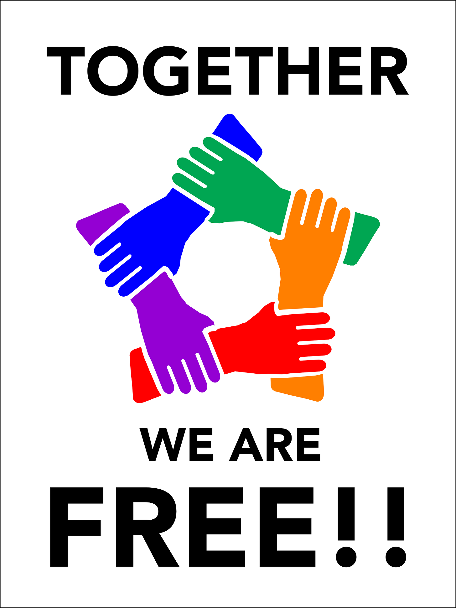SIGN: “TOGETHER WE ARE FREE! with rainbow hands. 18”x24” portrait orientation. CLICK HERE to download the full size files.
