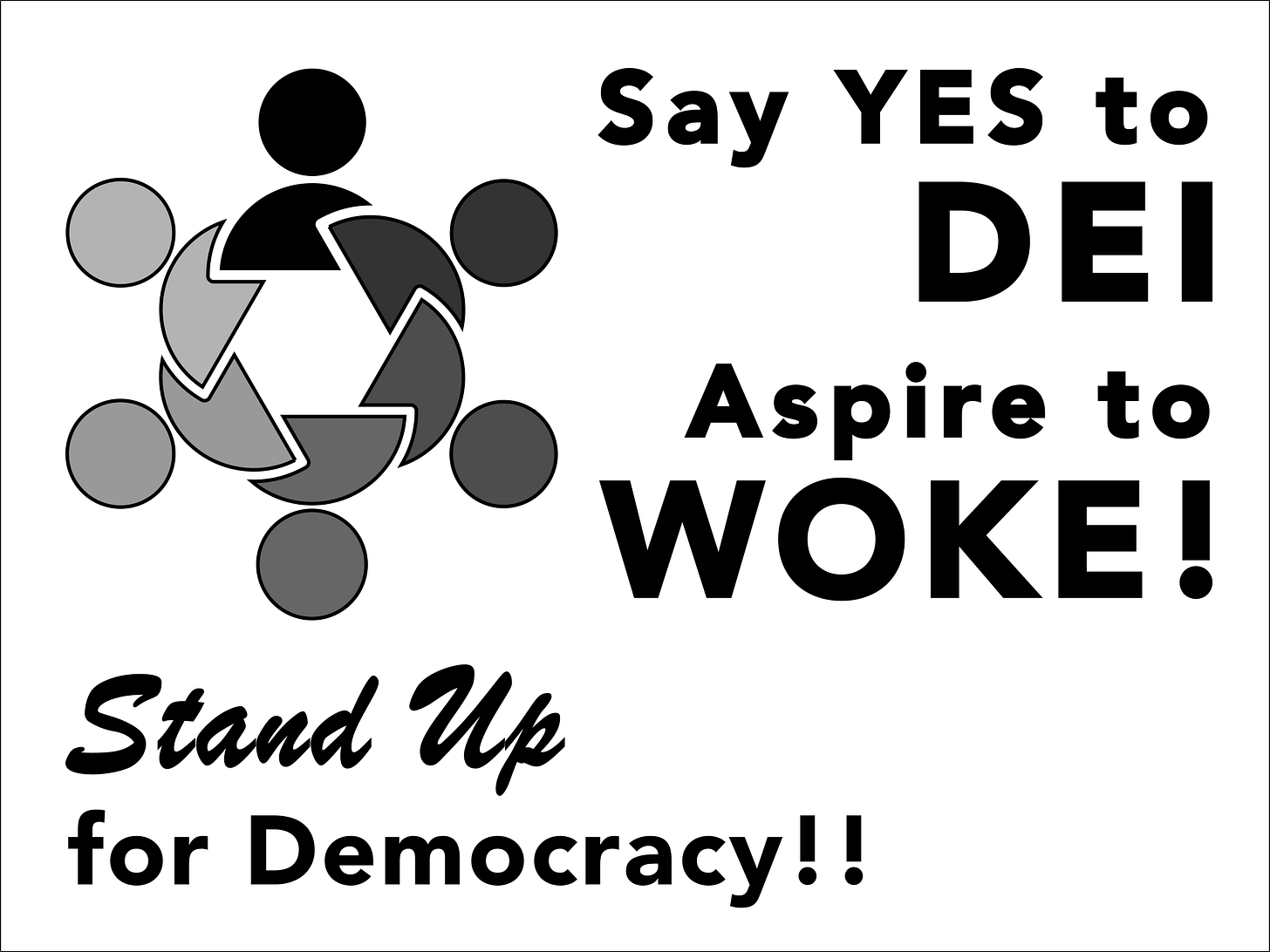 SIGN: “Say YES to DEI - Aspire to WOKE - Stand UP for DEMOCRACY.” 24”x18” landscape orientation. CLICK HERE to download the full size files.