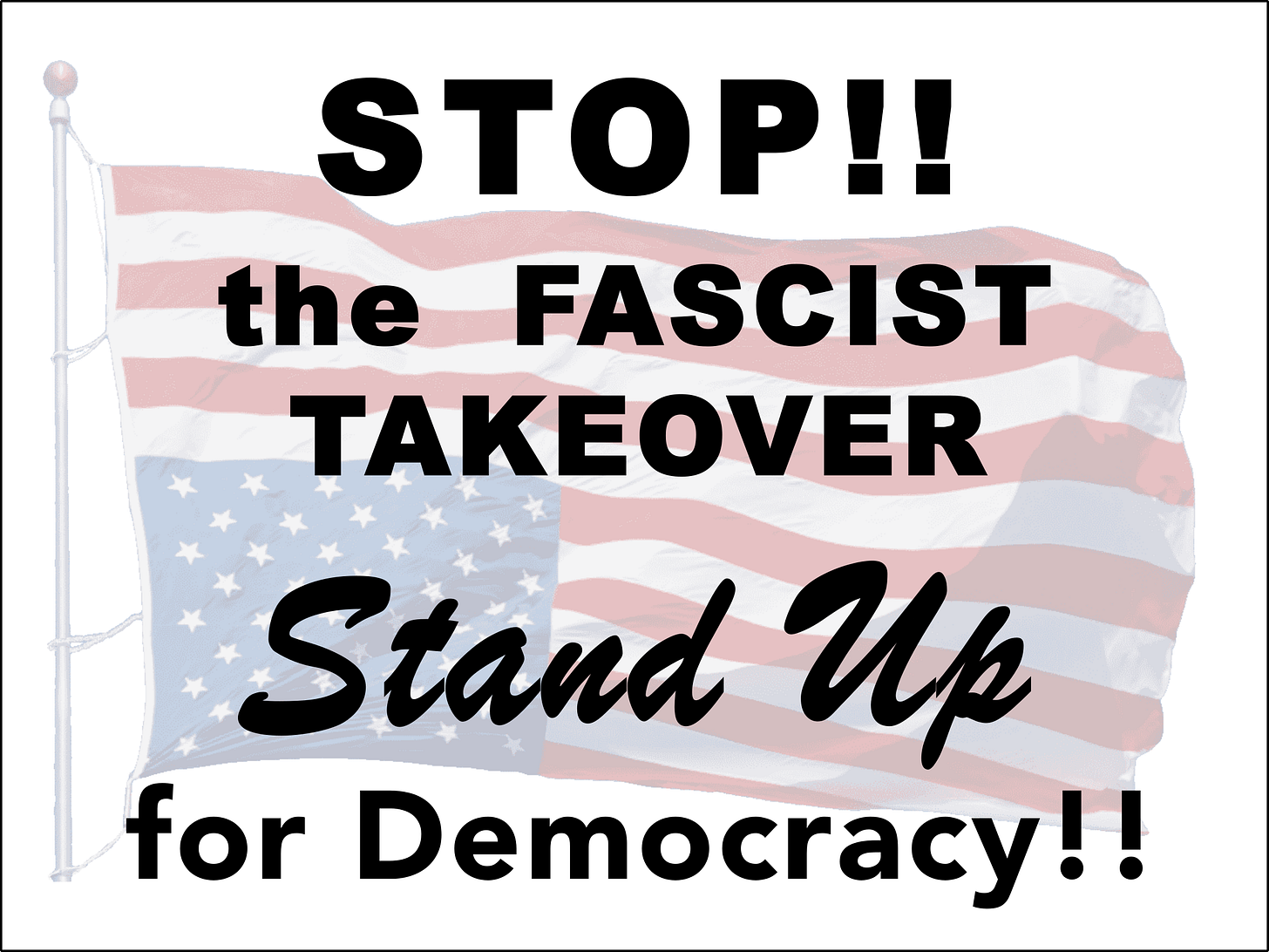 SIGN: “STOP!! the FASCIST TAKEOVER. Stand Up for Democracy!!” 24”x18” landscape orientation. CLICK HERE to download the full size files.
