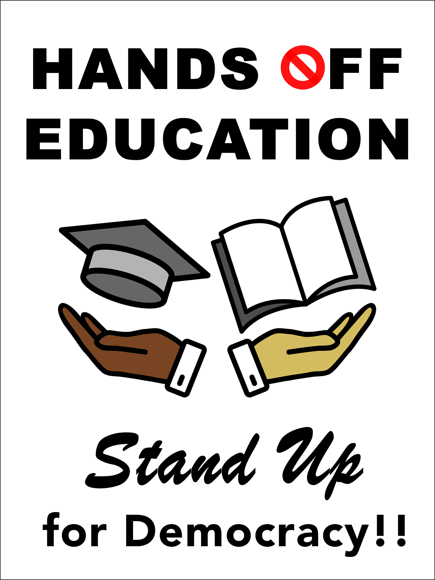 SIGN: “HANDS OFF EDUCATION. Stand Up for Democracy.” 18”x24” portrait orientation. CLICK HERE to download the full size files.