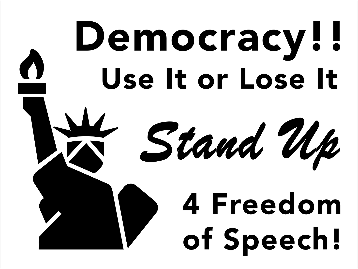 SIGN: “Democracy!! - Use It or Lose It - Stand UP 4 Freedom of Speech.” 24”x18” landscape orientation. CLICK HERE to download the full size files: